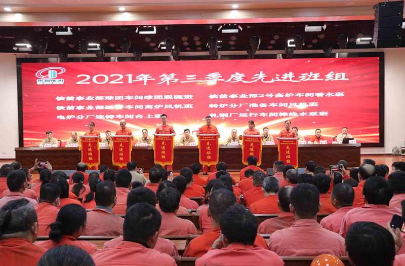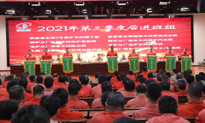 在2021年第三季度班组现场文明评比红绿旗颁发仪式上,公司领导分别为先进班组代表颁发流动红旗,为后进班组颁发流动绿旗。