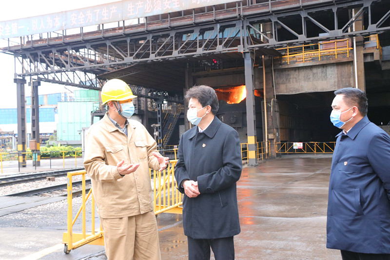 在2号高炉主控室,蒋耀生向何录春一行详细介绍了我公司疫情防控和生产经营情况。