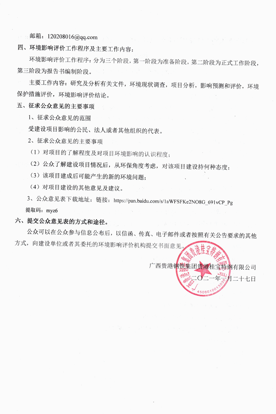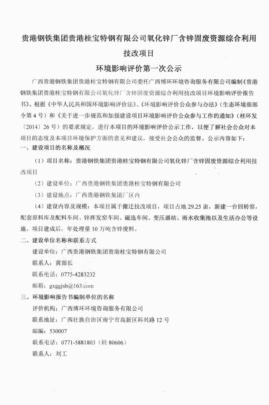 贵港钢铁集团贵港桂宝特钢有限公司氧化锌厂含锌固废资源综合利用技改项目环境影响评价第一次公示